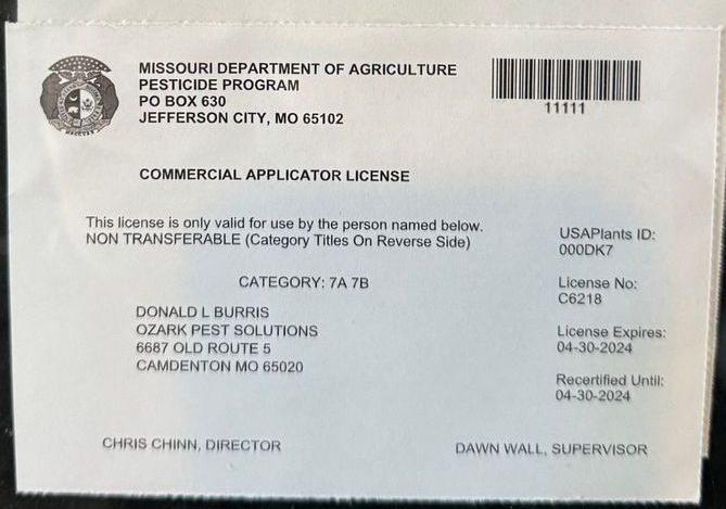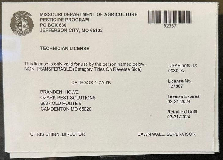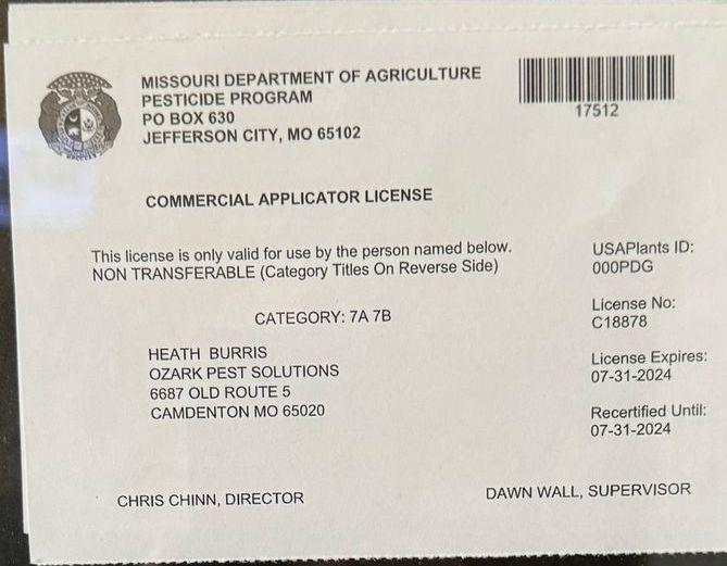 Ozark Pest Solutions is licensed and insured and has been a leader in the pest control industry since 1988. Our services are guaranteed, catering to both residential and commercial clients. We are proud members of the Missouri Pest Association, the National Pest Management Association, and the National Apartment Association.